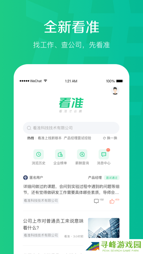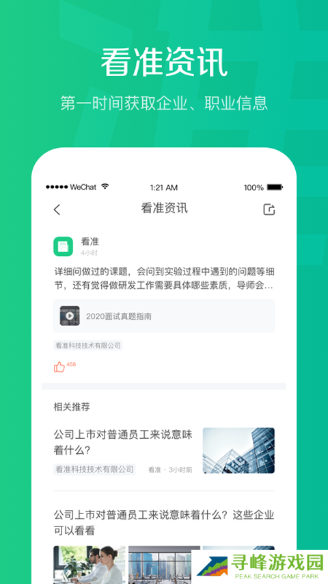 看准网可以帮助全国求职者找到自己心仪的工作,依托深耕于职场的真实数据,力求让每位求职责入对行、跟对人。全国超过220万家公司老鸟在这里分享求职经验,了解最真实的公司内幕,掌握行业最新发展动态,你想知道的职场信息都可以查询。找到心仪的工作可以直接与HR线上沟通,薪资待遇、工作内容都可以询问,加强求职者与人事的沟通。