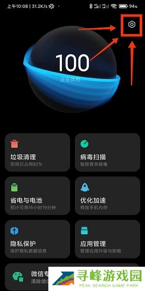 1、打开手机管家后,点击右上角的设置图标。