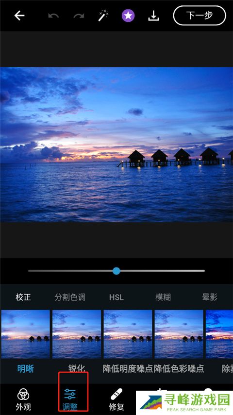 6、点击第二个图标,支持对图像进行锐化、降噪、模糊、晕影、HSL调整、色调分割等处理,并能手动调节曝光度、对比度等参数,滑动选项条还可进一步微调;