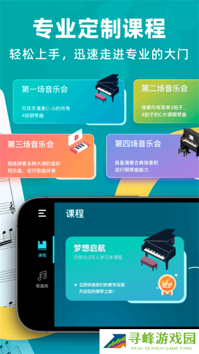 通过自学钢琴可以让没有钢琴基础的用户也能上手进行学习,让钢琴地学习不再困难,其中采用了循序渐进的学习课程,来让用户更快地上手进行钢琴学习,掌握钢琴练习的基础。