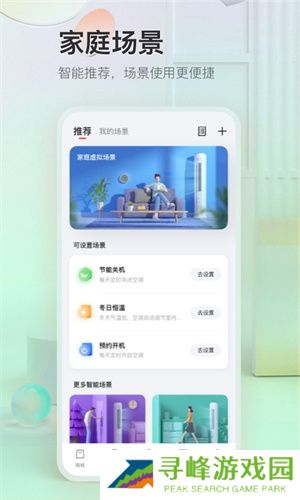 5、在【场景】界面,可以查看家庭虚拟场景,可调整定时开启空调、节能关机、定时除湿、夏日恒温和冬日恒温的场景。