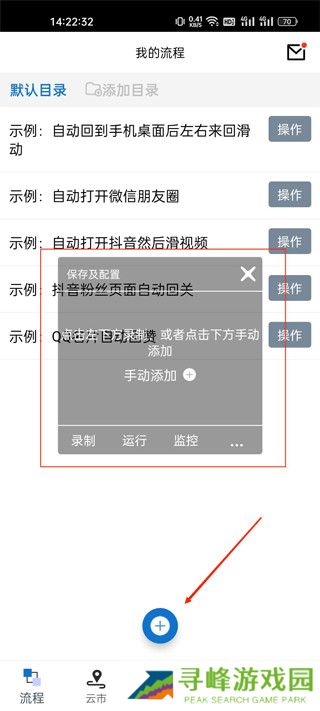 1、启动触控精灵程序,在流程界面点击添加按钮,系统将弹出浮动窗口,您需要在此窗口中进行后续操作。如果未出现浮窗,请进入应用设置并根据提示开启浮窗权限。
