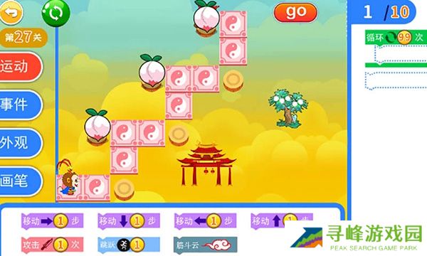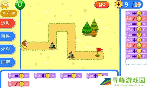 儿童编程启蒙是为3~12岁孩子们打造的一款编程学习软件,根据低年龄段孩子们的认知能力,将原本复杂的C语言代码字段简化成一个个积木拼图,孩子们只需要通过拖动组合代码积木就可以完成代码编写,锻炼孩子们的逻辑能力。以悟空一行西游取经的故事为背景,通过将不同的程序积木块拼接在一起实现角色的移动、攻击、跳跃等动作,实现寓教于乐,提高孩子们对编程知识的兴趣。