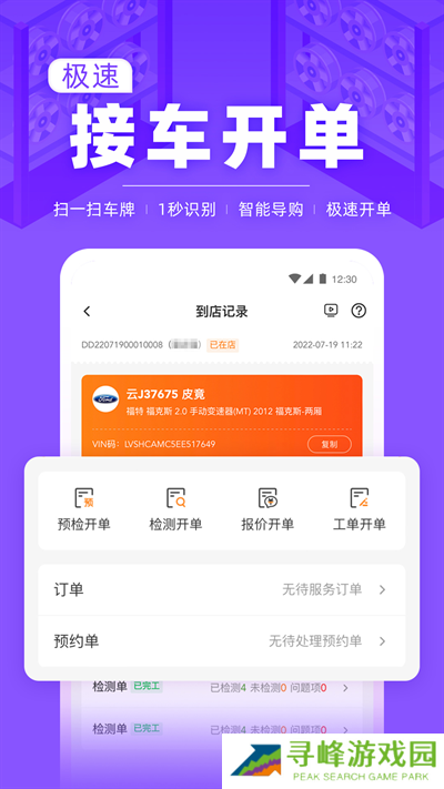 1、线上快速接车开单,手机扫一扫车牌接车,1秒识别,10秒即可将开单。