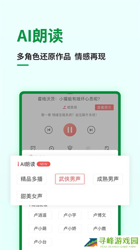 飞卢听书也被叫做飞卢小说,这是国内最大的原创小说资源库之一,飞卢小说网站上的原版书籍在这里全部都免费看,对哪种小说感兴趣直接输入小说名称搜索,看到的都是读者喜欢的资源。如果不想长时间拿着手机看小说,打开小说后可以开启听书功能,由AI评书家为读者们朗读书中的故事,用耳朵“看书”,解放读者的双手与双眼,让阅读变得更休闲。
