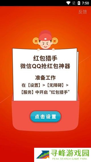 1.完成最新版红包猎手的下载与安装后,点击“点击设置”进入配置界面;